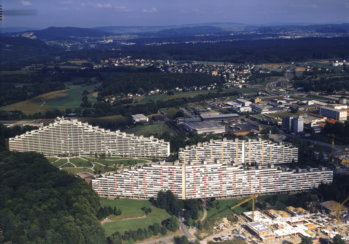 Überbauung Telli in Aarau im September 1983, Blick nach Osten. Architektur: Marti & Kast, Zürich. Bauzeit: 1972–1990. Bildnachweis: ETH-Bibliothek Zürich, Bildarchiv / Fotograf: Comet Photo AG (Zürich) / Com_FC01-5000-018 / CC BY-SA 4.0